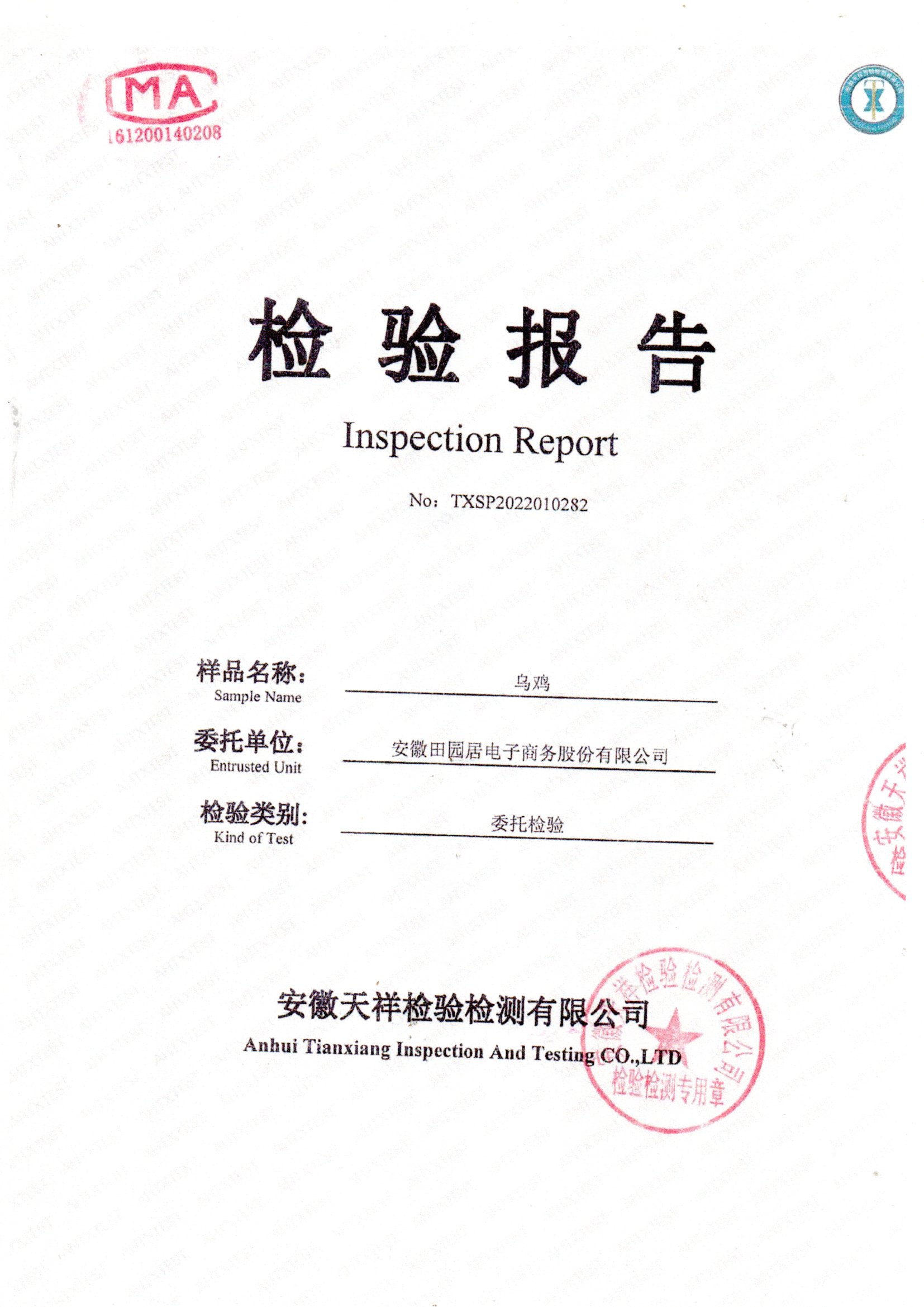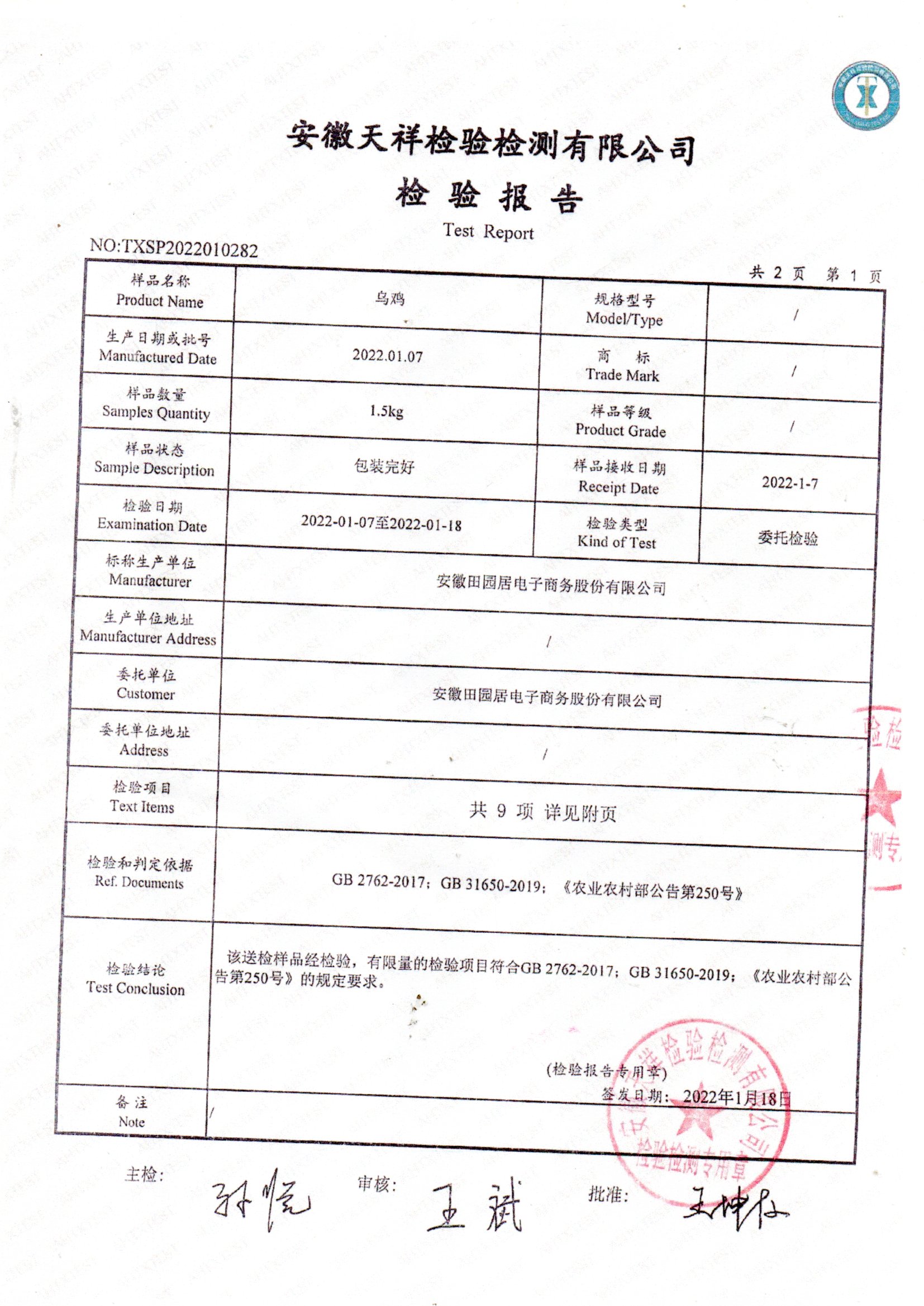 2022年01月乌鸡检测报告