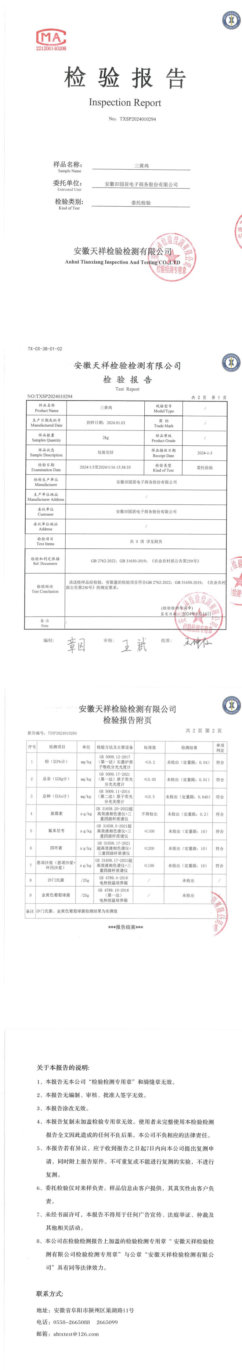 2024年01月03日三黄鸡检测报告