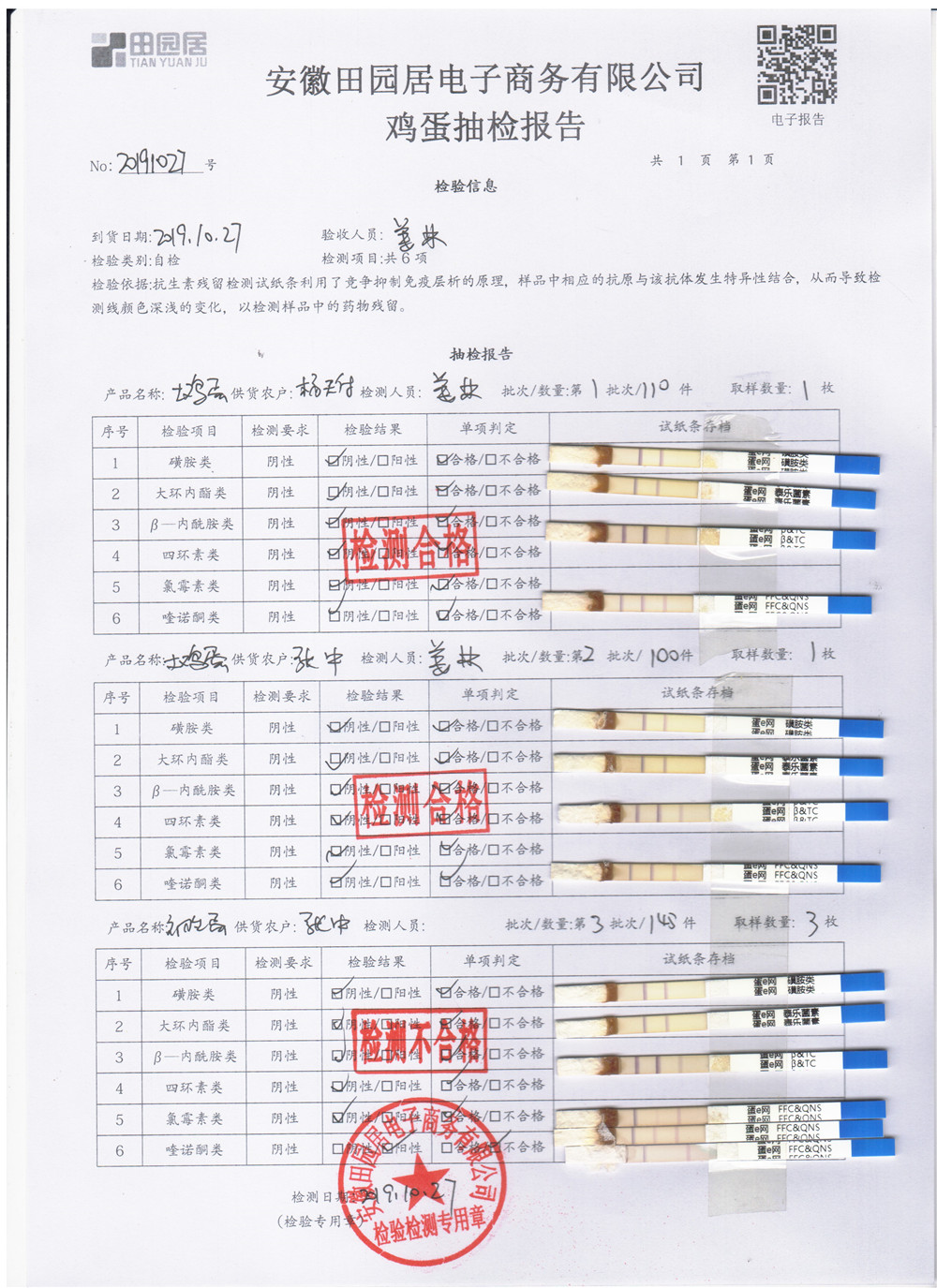 2019年10月27日鲜鸡蛋检测报告