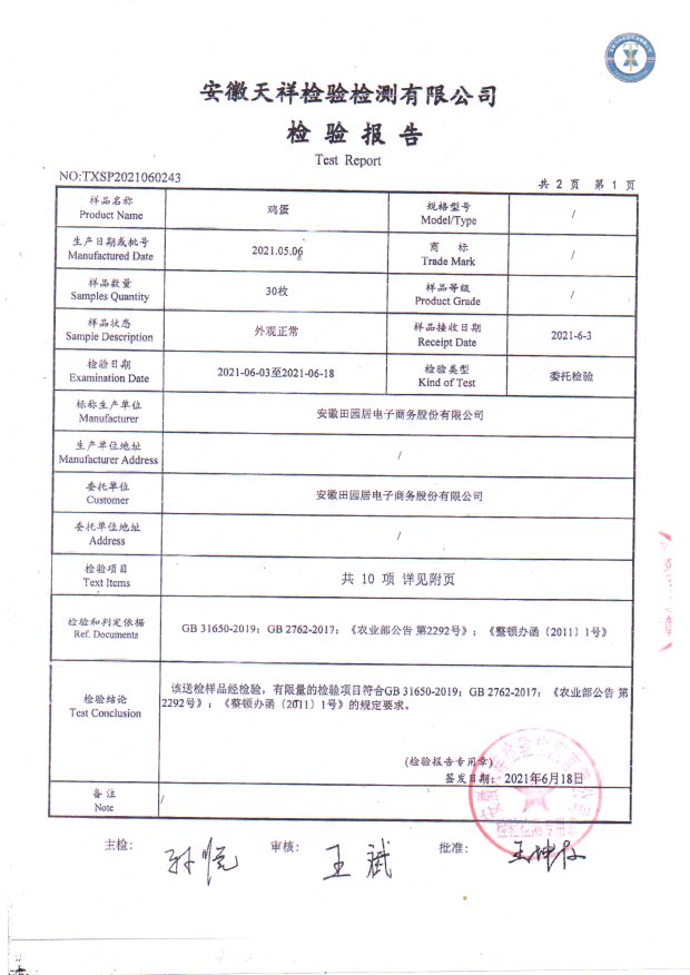 2021.6月鲜鸡蛋检测报告