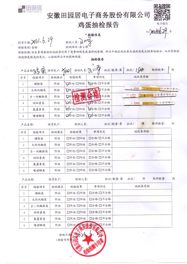 2021年6月29日鲜鸡蛋检测报告