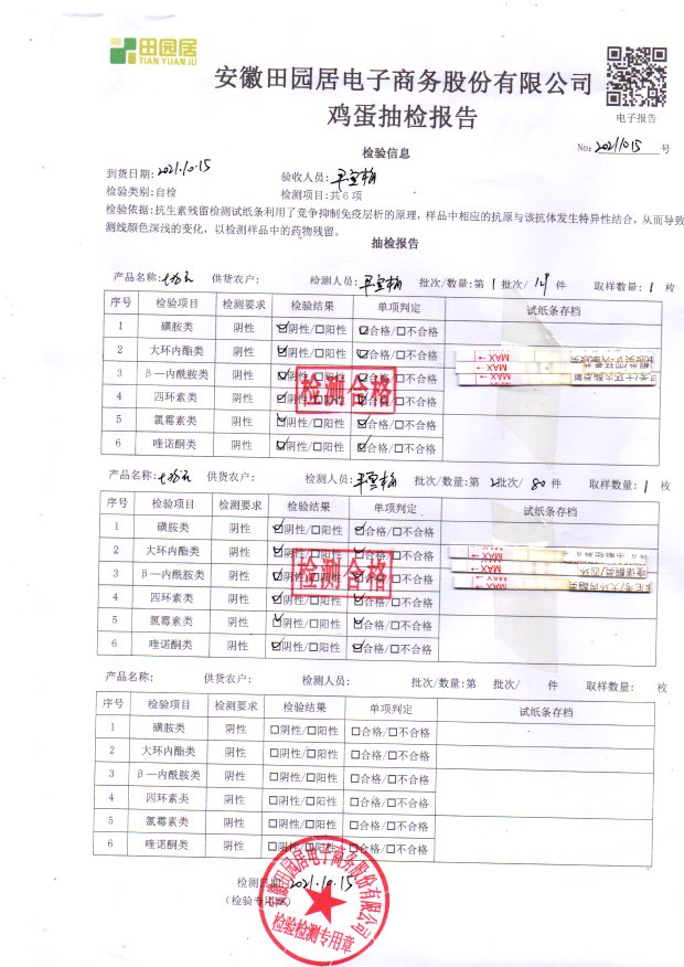 2021年10月15号鲜鸡蛋检测报告