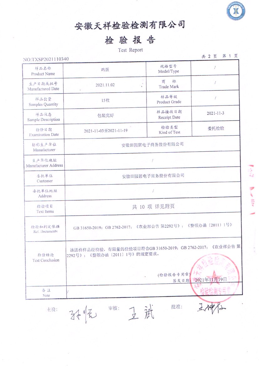2021年11月鲜鸡蛋检测报告
