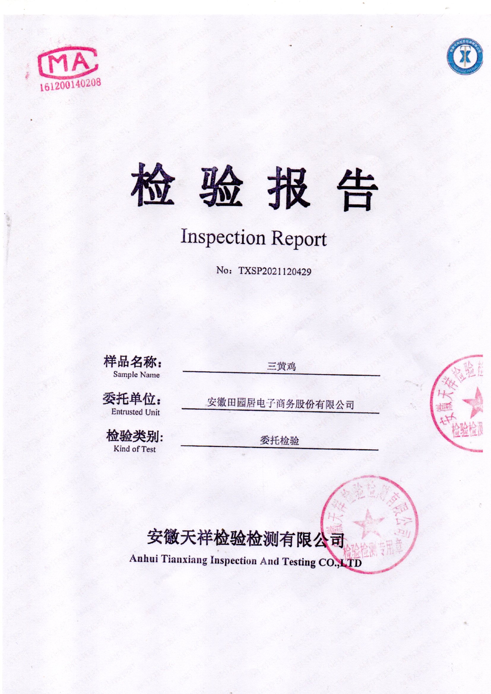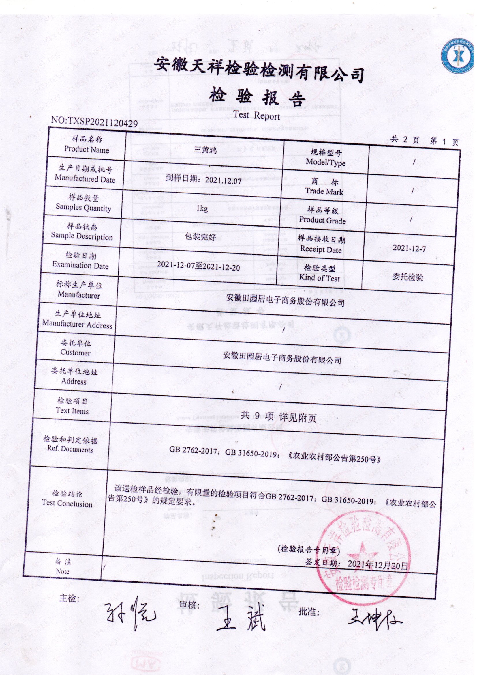 2021年12月三黄鸡检测报告