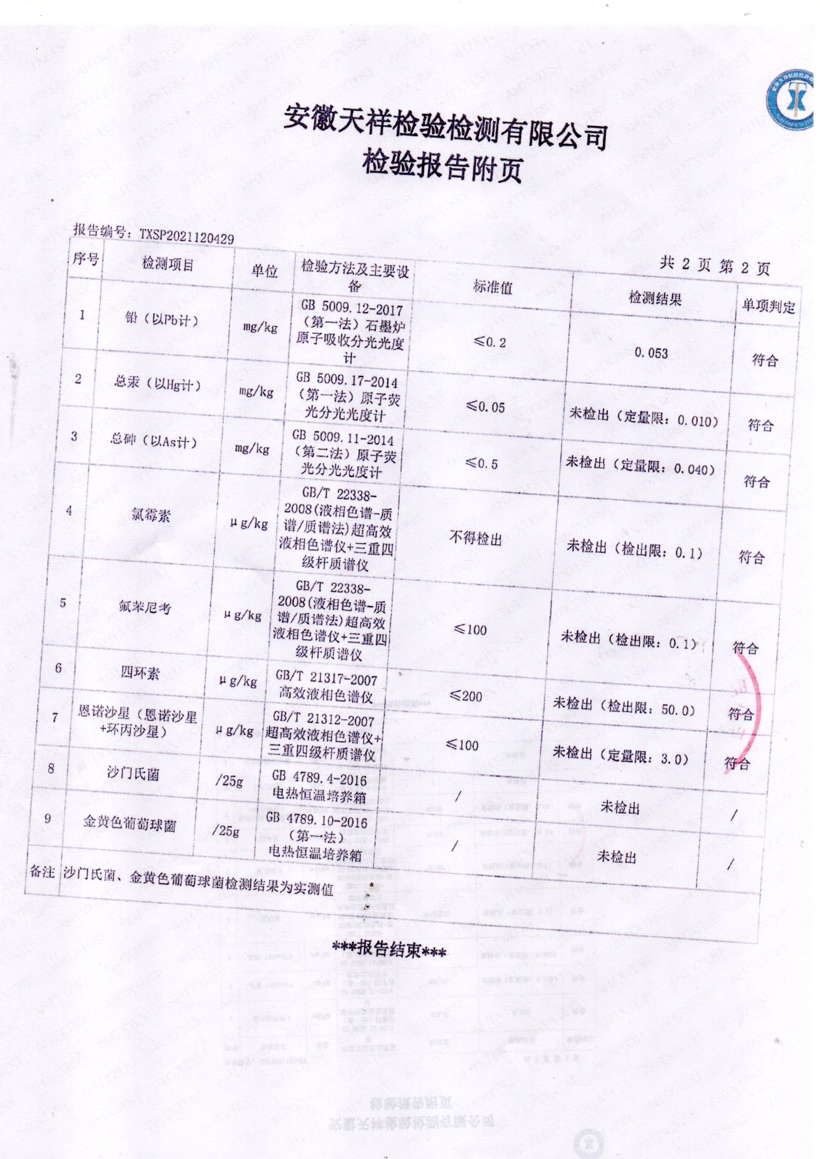 2021年12月鲜鸡蛋检测报告